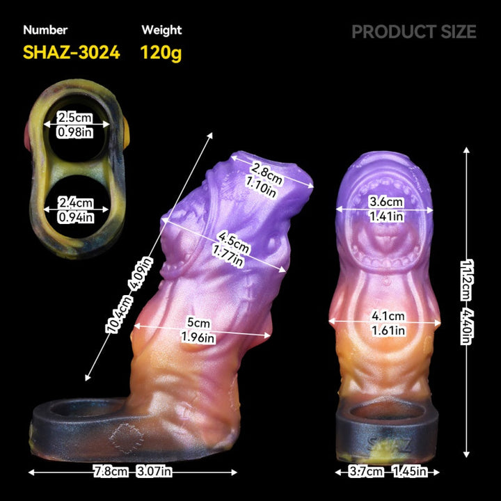 This penis extender presents a dynamic tapering structure from base to tip. ending in a head shaped like a gaping alien mouth or insectoid mandible. Covered in irregular bumps and deep folds. its tactile design delivers an extraordinary stimulation experience. The front end narrows to just 1.10 inches. gradually thickening toward the 1.96-inch base—creating a stark front-light/back-heavy balance that ensures both secure wear and ergonomic comfort.