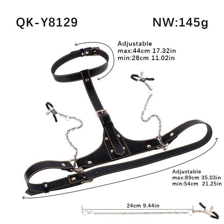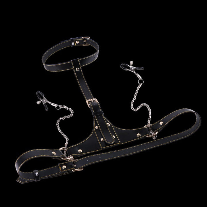 The carefully crafted leather ensures a comfortable yet secure fit. while the nipple clamps provide additional stimulation. perfect for enhancing your dominant or submissive role in BDSM play.