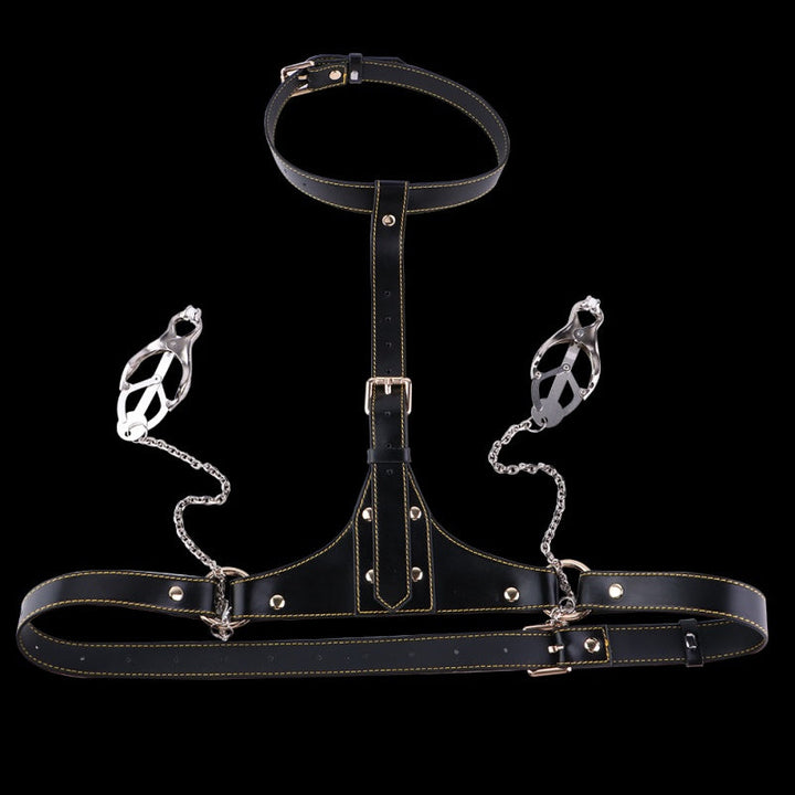 Crafted from premium black leather with reinforced stitching and metal hardware. this bondage harness nipple clamps is designed to wrap around the neck and torso. binding the chest in place while delivering intense nipple play.