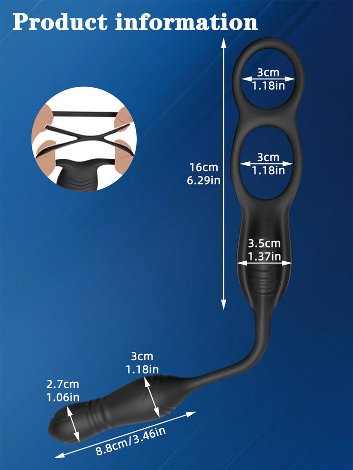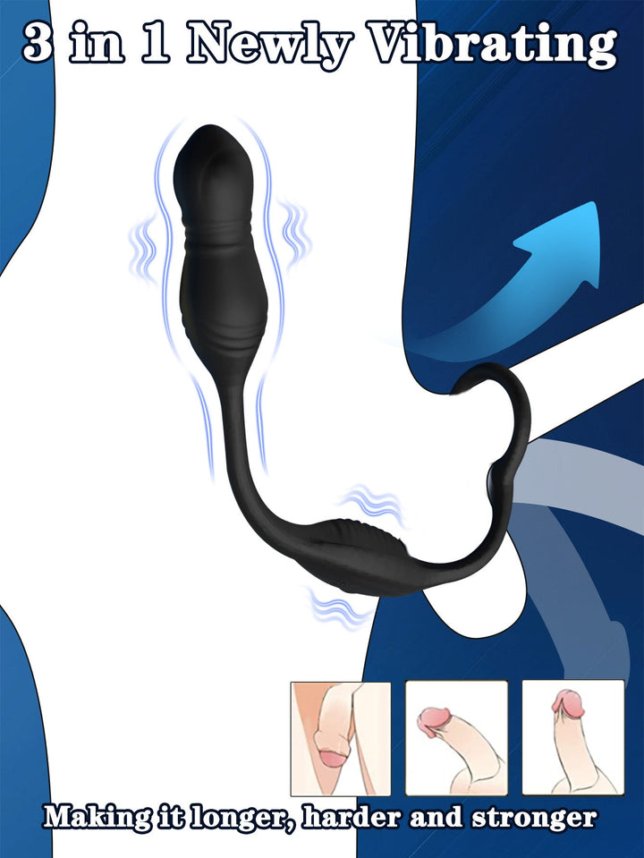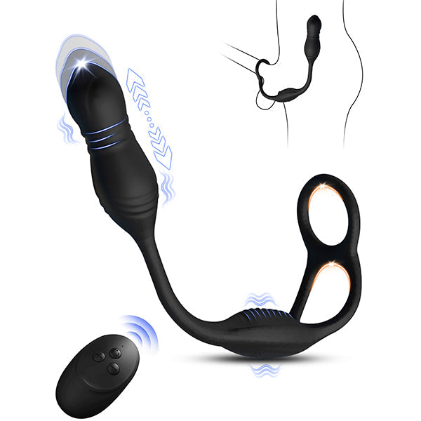 Features: Vibrating cock ring. thrusting anal dildo. remote control. customizable vibration modes and intensities