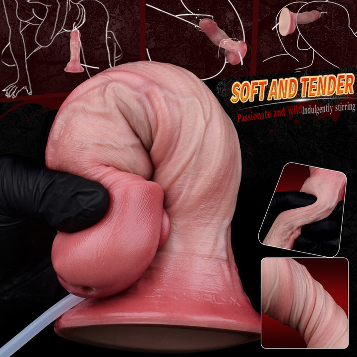 This squirting dildo is designed for a completely immersive experience. The dual-layer design gives you the best of both worlds: a firm. supportive core and a soft. realistic exterior.