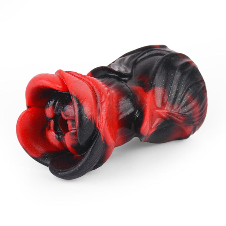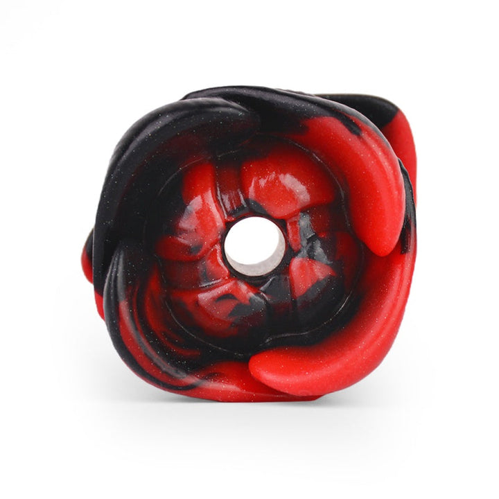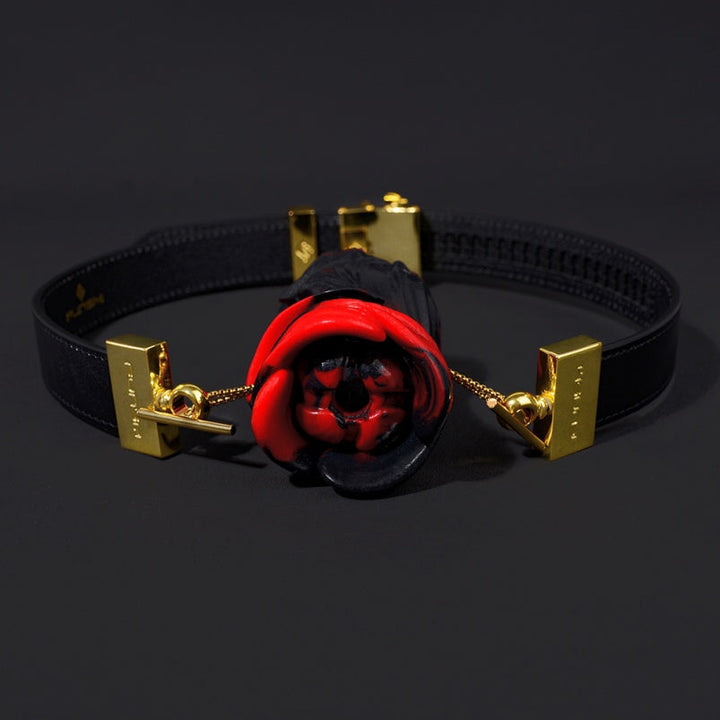 A stunning red rose with black detailing sits at the center—delicately molded from body-safe silicone. shaped to rest gently in the mouth while holding it open in quiet restraint.